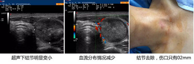 2、不开刀,创伤小:不损伤周围血管、气管,伤口只有0.2mm,术后贴个创口贴。